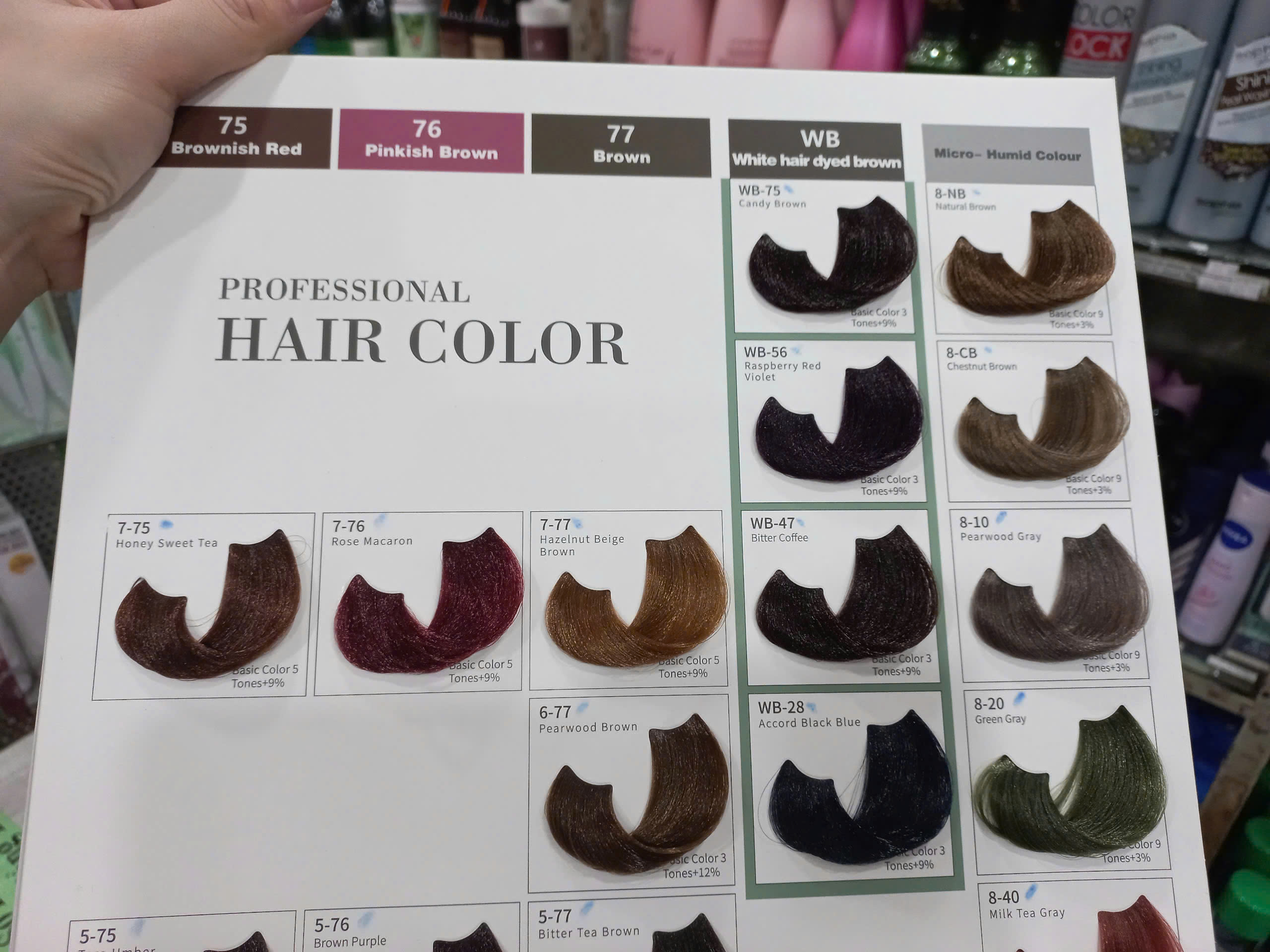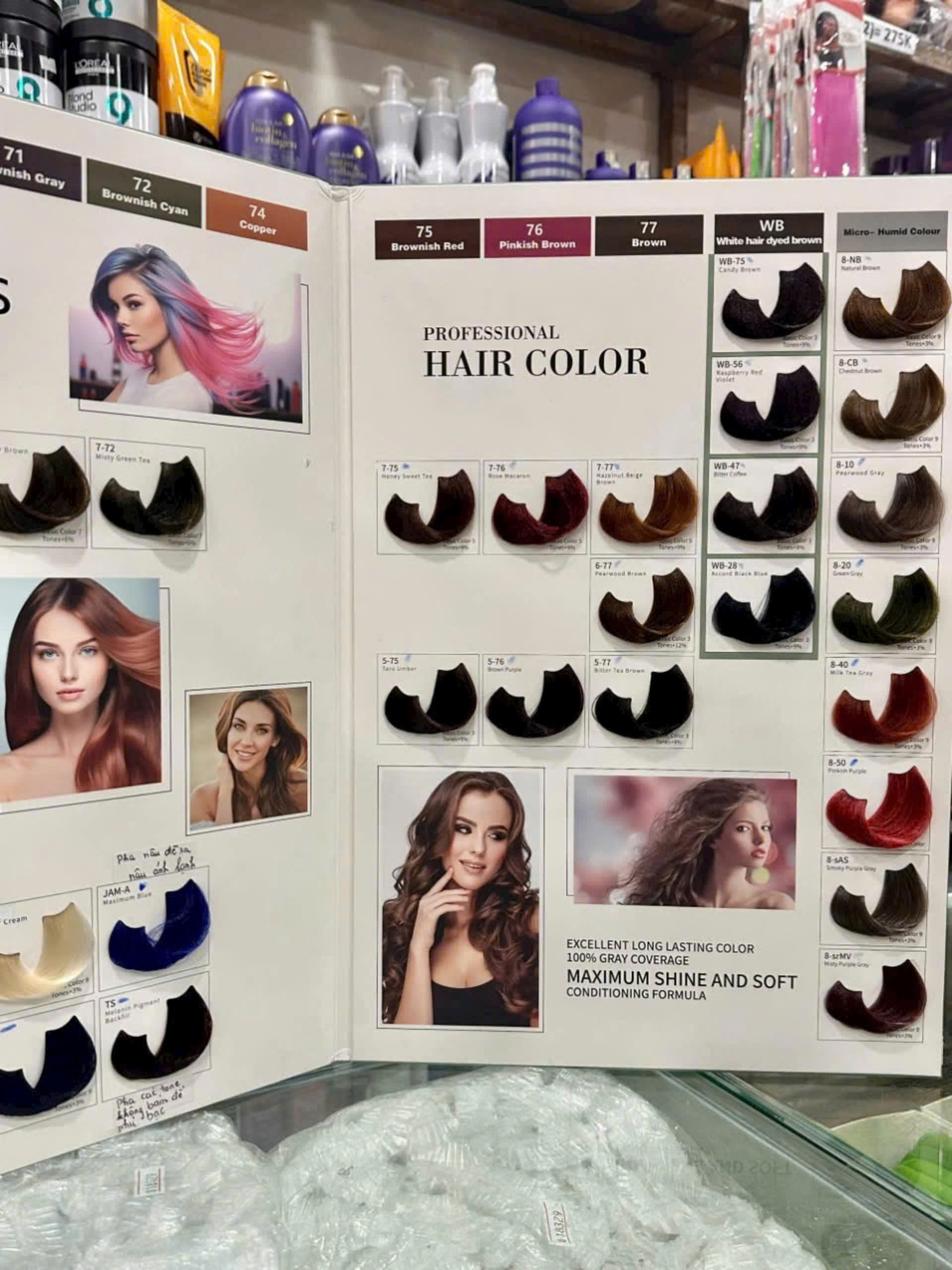 Bảng màu đa dạng: từ tông tự nhiên (đen, nâu, nâu sáng) đến tông thời trang (khói, rêu, ánh kim, tím, đỏ, vàng).