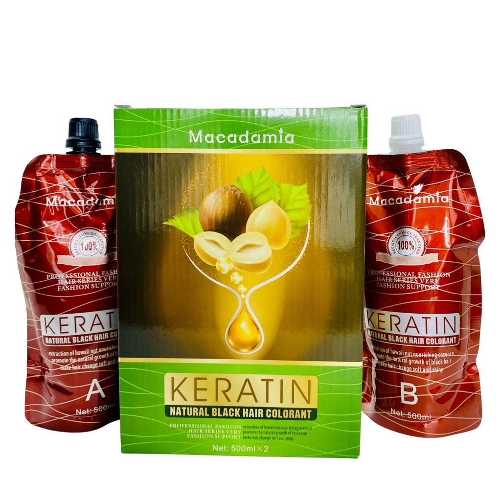 - Chiết xuất từ hạt Maccadamia chứa nhiều Dưỡng chất + Keratin giúp tóc bóng mượt, đen tự nhiên.