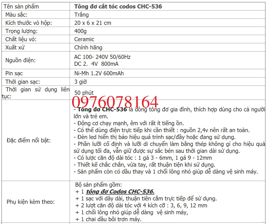 Tông Đơ Cắt Tóc Codos 536 có bán tại Hà Nội, vui lòng liên hệ 0976078164 để được tư vấn mua hàng. Ship cod toàn quốc nhận hàng kiểm tra thanh toán.