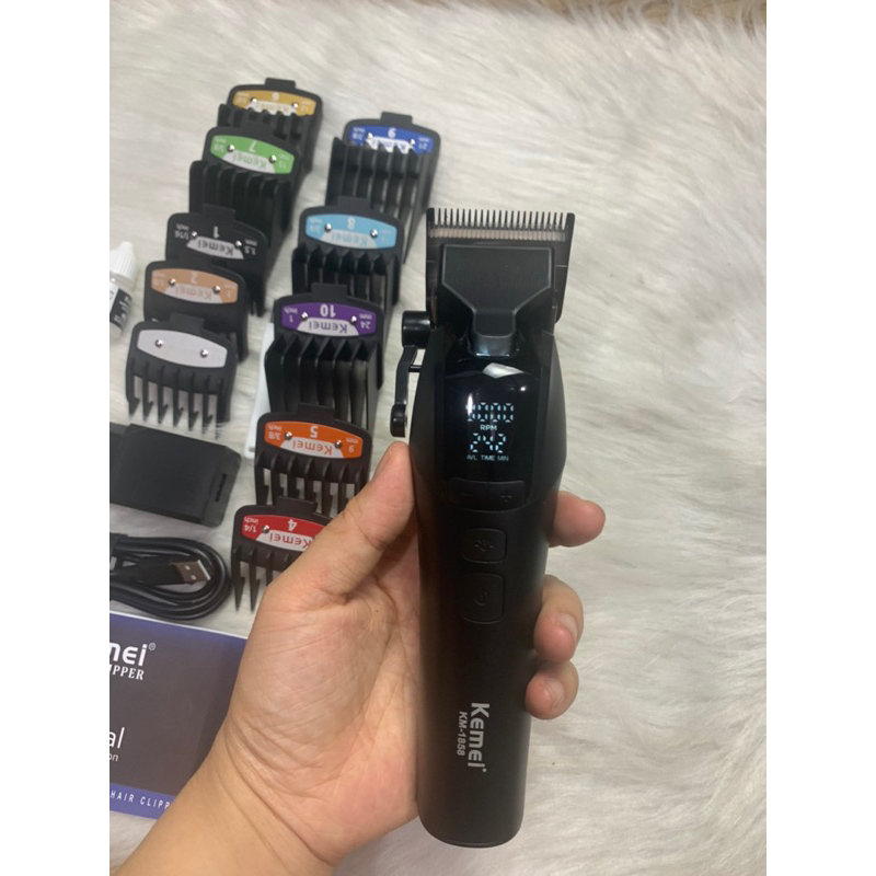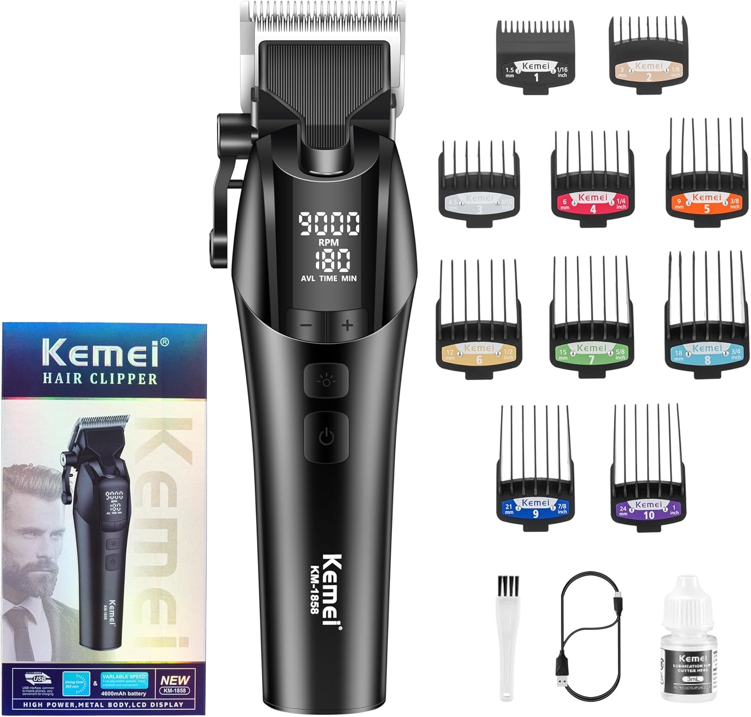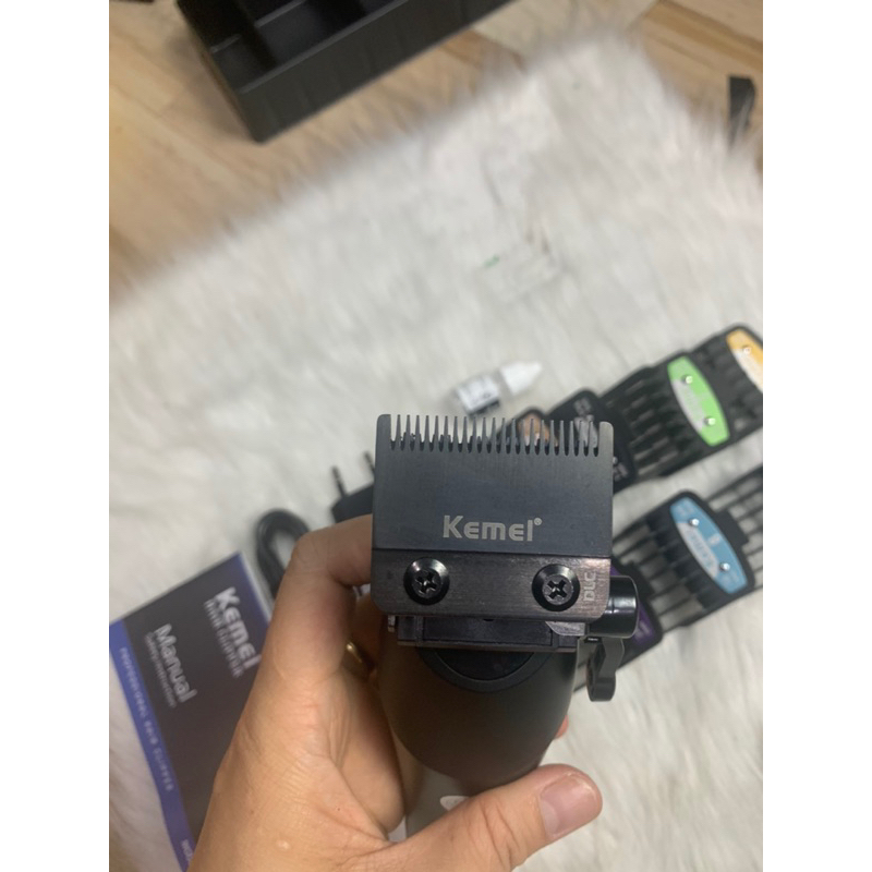 Phụ kiện: Tông đơ Kemei KM-858, 10 cữ (1.5mm; 3mm; 4.5mm; 6mm; 9mm; 12mm; 15mm; 18mm; 21mm; 24mm); 1 dầu tra, chổi vệ sinh, sạc điện, sách hướng dẫn